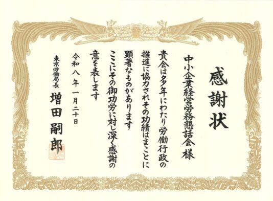 東京労働局長表彰として感謝状が授与されました